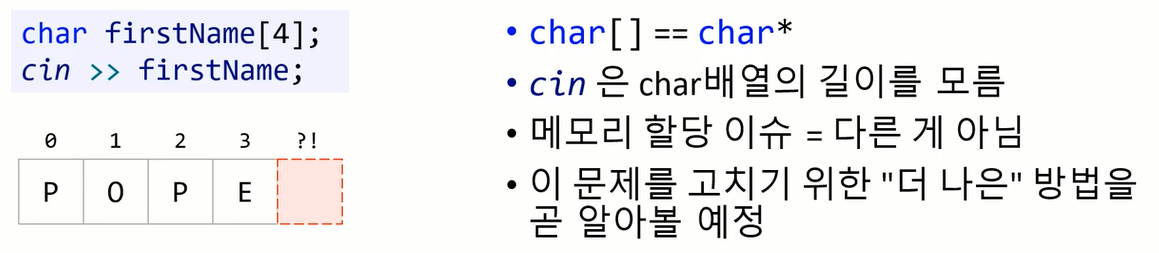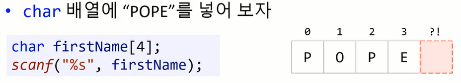 위 예제에서 문자 끝에 NULL 캐릭터가 있어야 하는데 NULL 캐릭터를 넣으려 하니까 빨간색 부분이 우리가 소유하지 않은 메모리임. 따라서 우리가 소유하지 않은 메모리를 덮어 쓰는 문제가 생김.